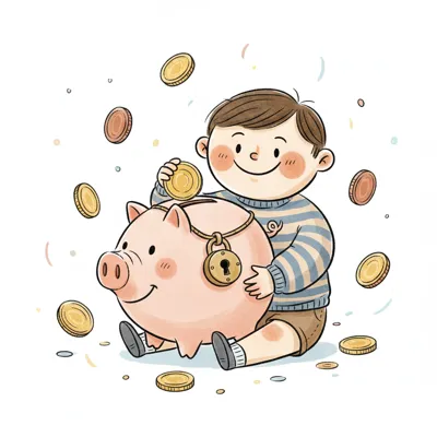 Ein lächelnder Junge steckt eine Münze in ein rosa Sparschwein mit Schloss, umgeben von fallenden Münzen.
