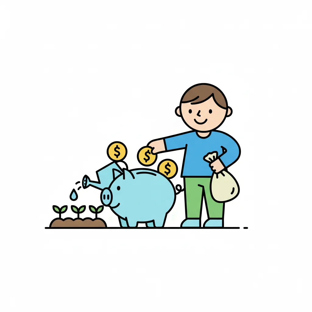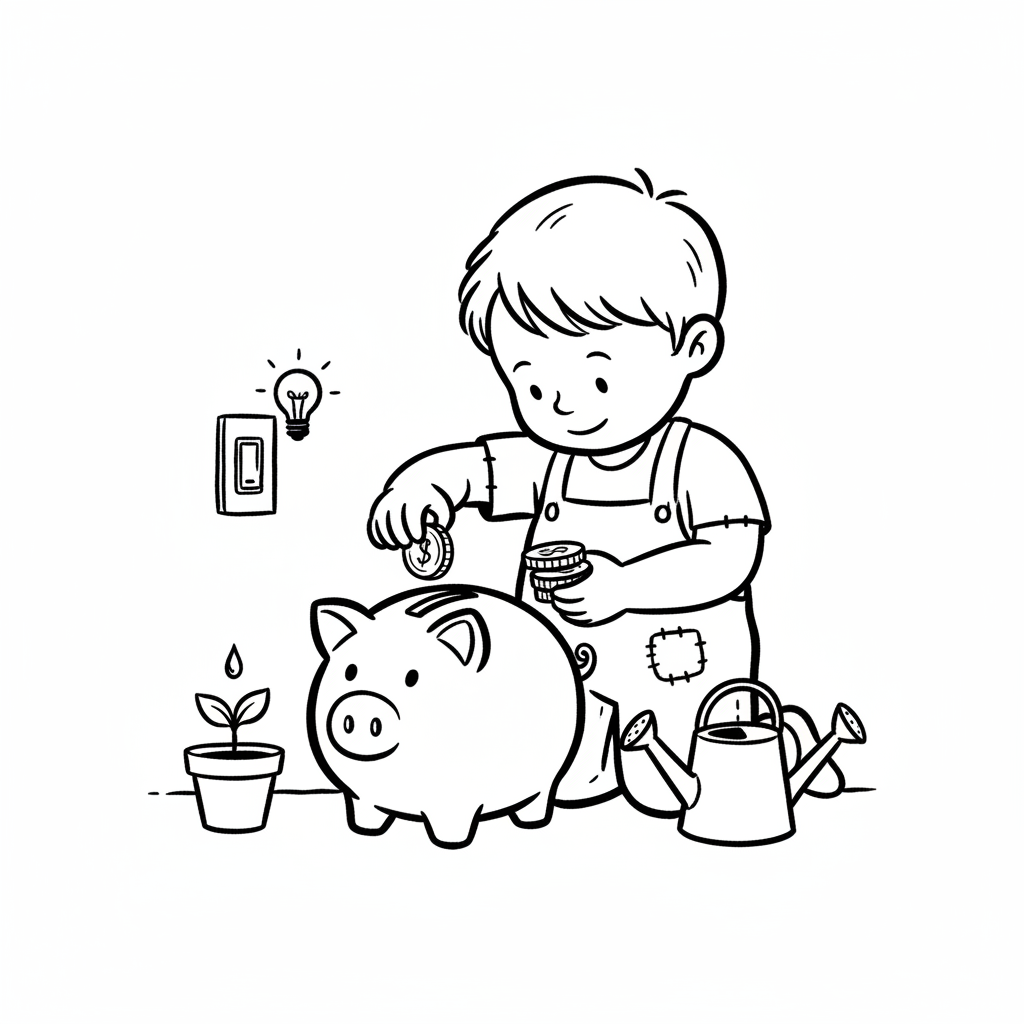 Ein Kind steckt Münzen in ein Sparschwein, umgeben von Symbolen für Wachstum und Ideen.