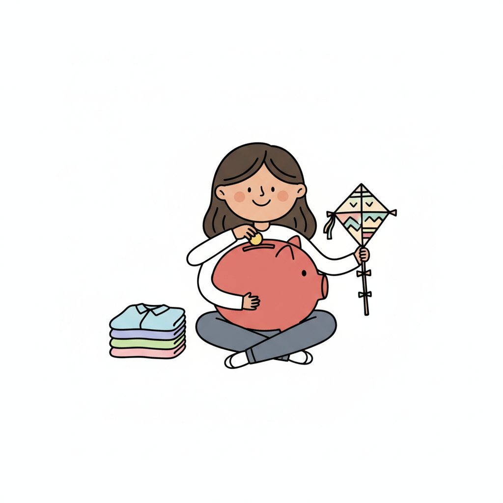 Eine lächelnde Person steckt eine Münze in ein Sparschwein, hält einen Drachen. Kleidung liegt daneben.