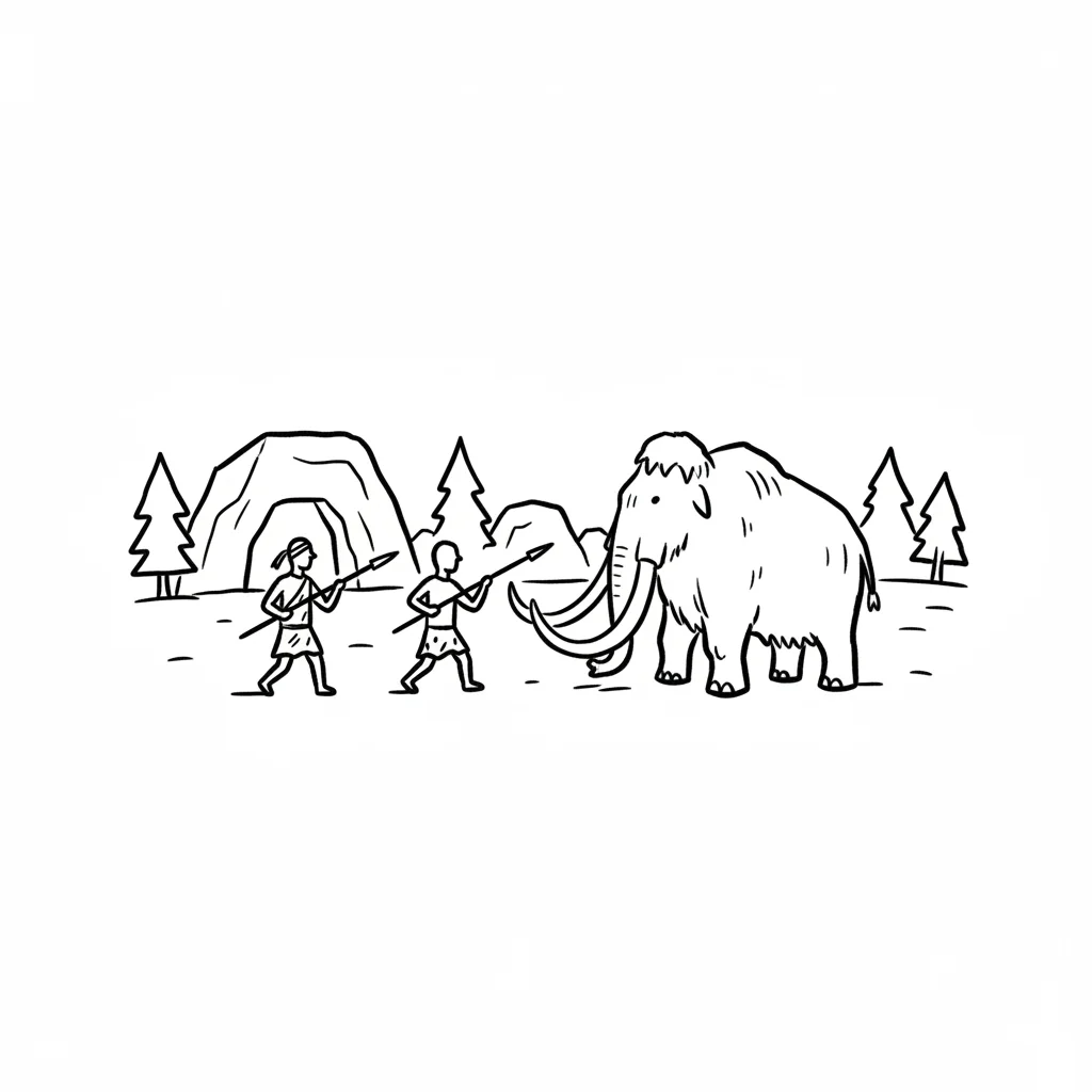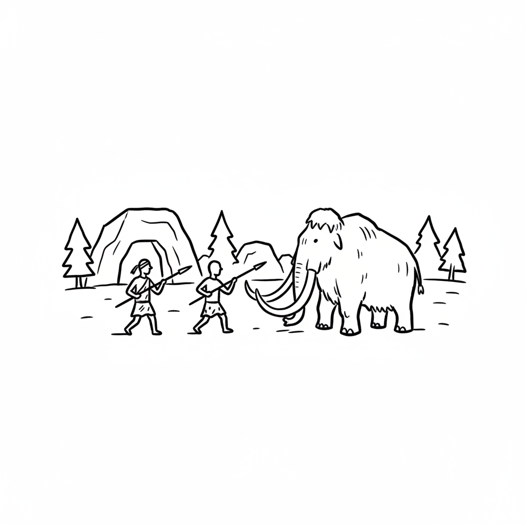 Zwei Höhlenmenschen jagen ein Mammut mit Speeren vor einer Höhle und Bäumen in einer Strichzeichnung.