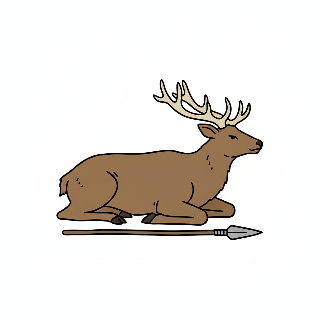 Brauner Hirsch mit Geweih liegt neben einem Speer. Einfache, cartoonartige Zeichnung.