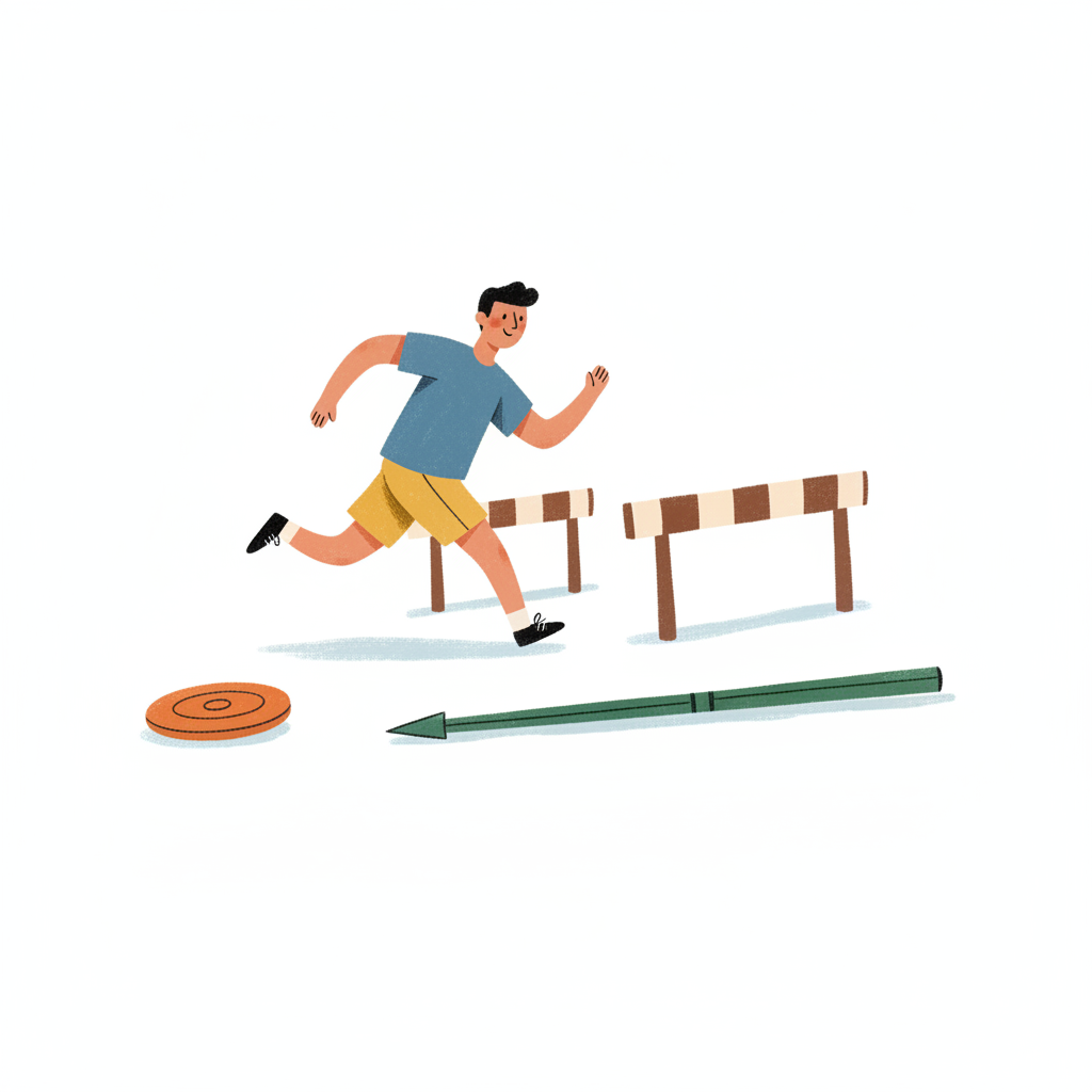 Ein Läufer rennt an Hürden, Diskus und Speer vorbei, symbolisiert Leichtathletik.