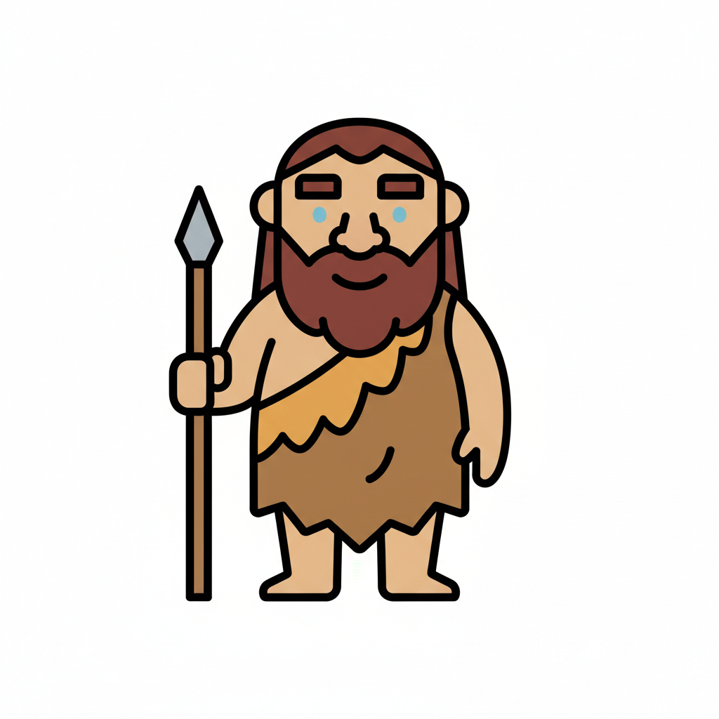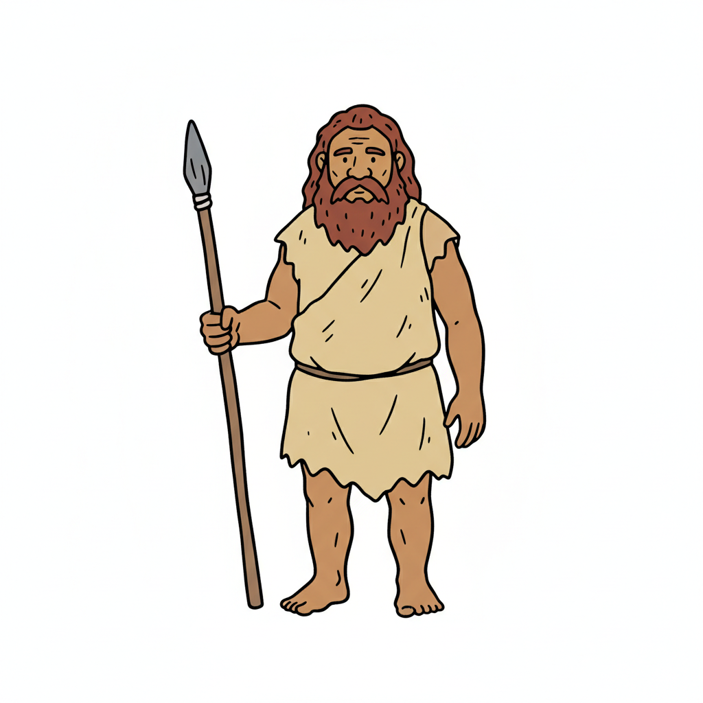 Gezeichneter Höhlenmensch mit Bart, Fellkleidung und Speer, stehend auf weißem Hintergrund.