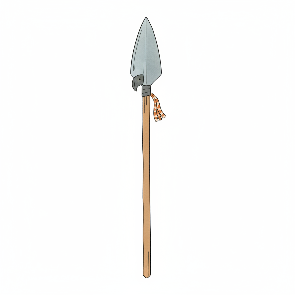 Ein illustrierter Speer mit spitzer Metallspitze, Holzschaft und einem verzierten Band.