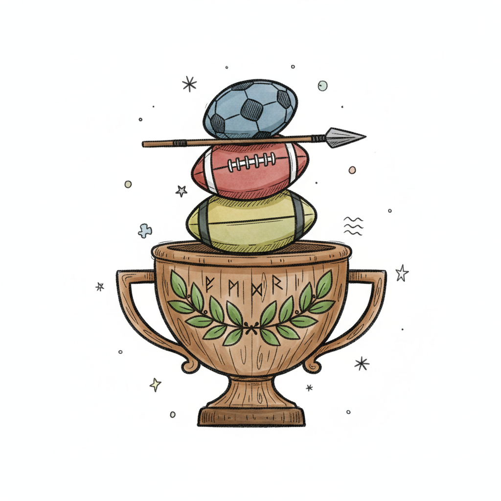 Eine illustrierte Holztrophäe mit gestapelten Sportbällen (Fußball, American Football) und einem Speer.