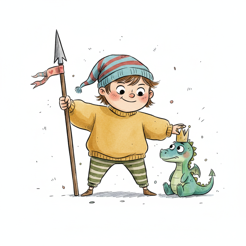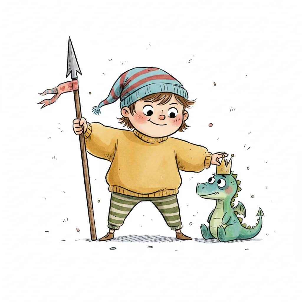Ein Kind mit Speer krönt einen kleinen Drachen. Eine süße Szene voller Fantasie und Freundschaft.