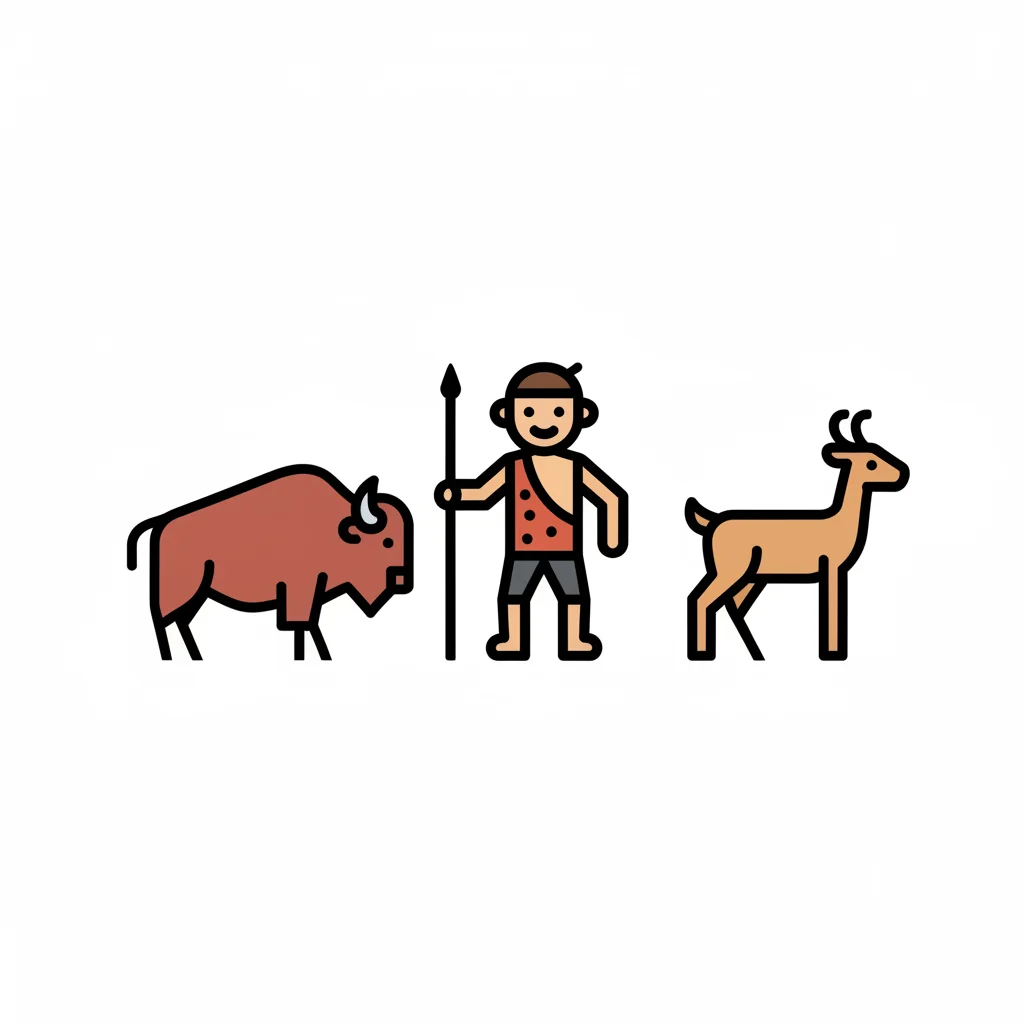 Cartoon eines Höhlenmenschen mit Speer, Büffel und Hirsch, der Jagd oder prähistorisches Leben darstellt.
