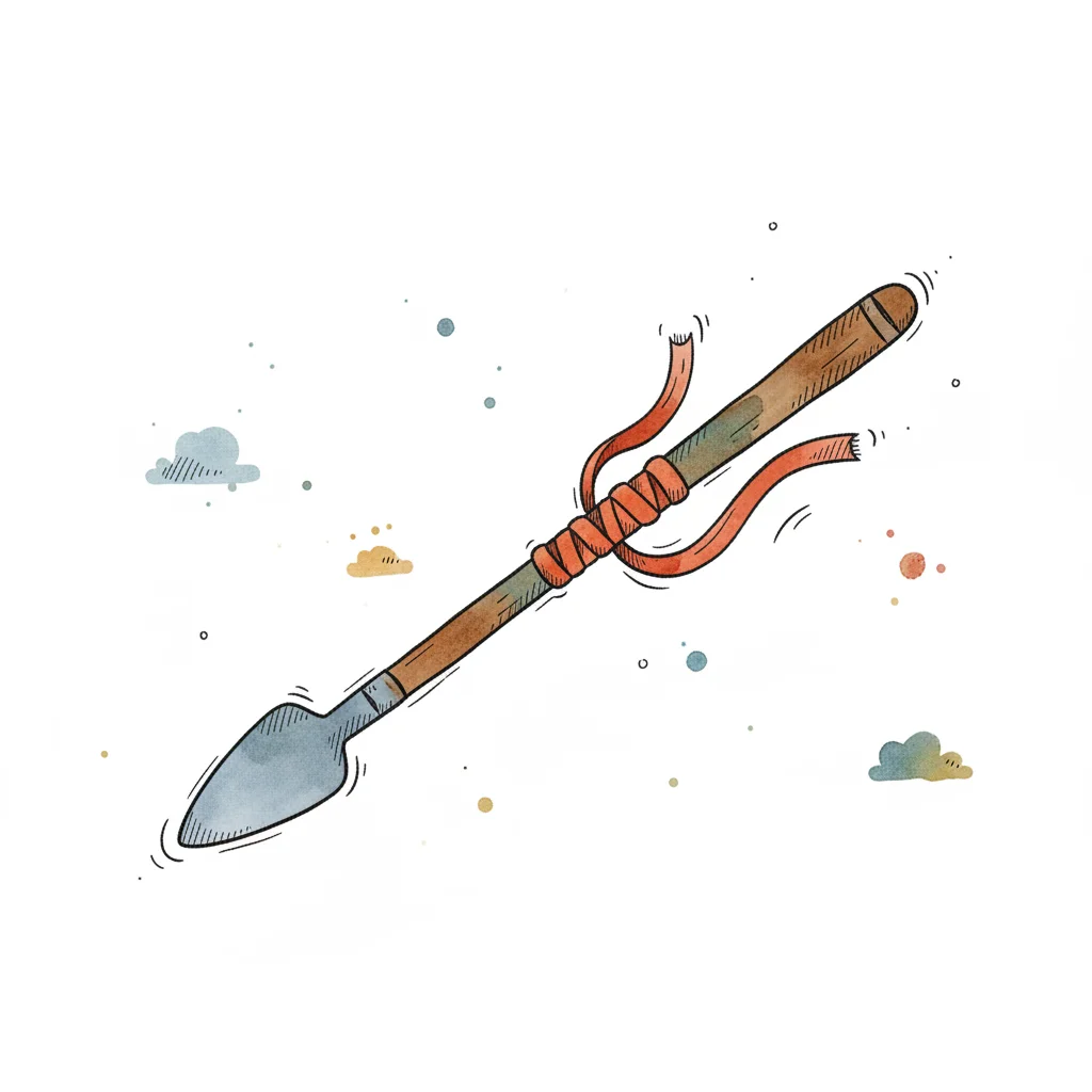 Aquarell-Illustration eines Speers mit Metallspitze, Holzschaft und rotem Band.
