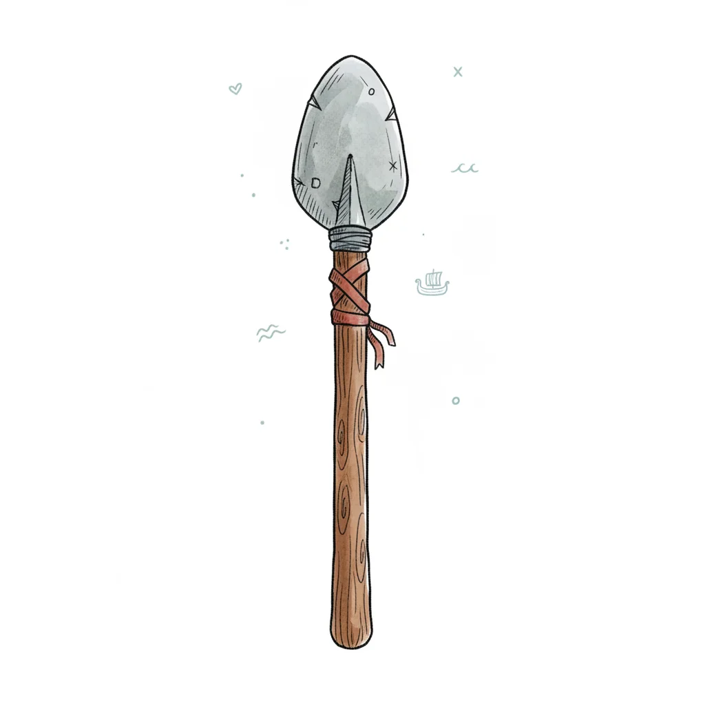 Stilisierte Illustration eines Speers mit Holzschaft und blauer Spitze auf weißem Hintergrund.