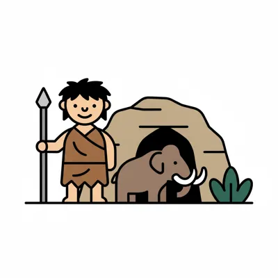Cartoon-Höhlenmensch mit Speer vor einer Höhle, aus der ein Mammut schaut.