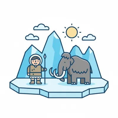 Cartoon eines prähistorischen Menschen mit Speer und Mammut in einer eisigen Berglandschaft unter der Sonne.