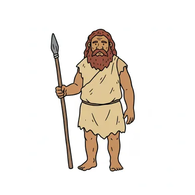 Cartoon eines Höhlenmenschen mit Bart, Fellkleidung und Speer.