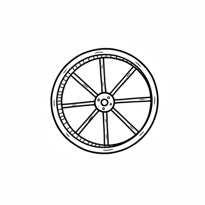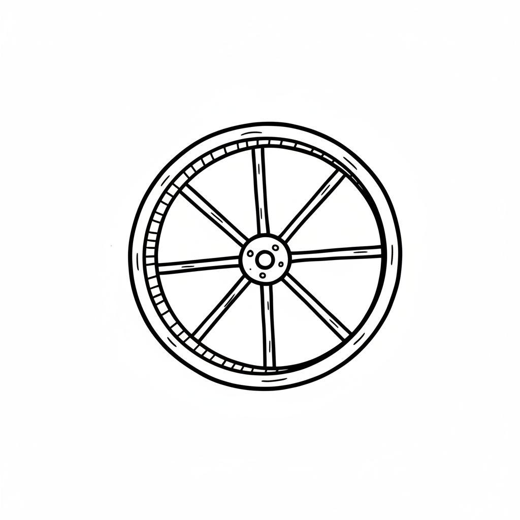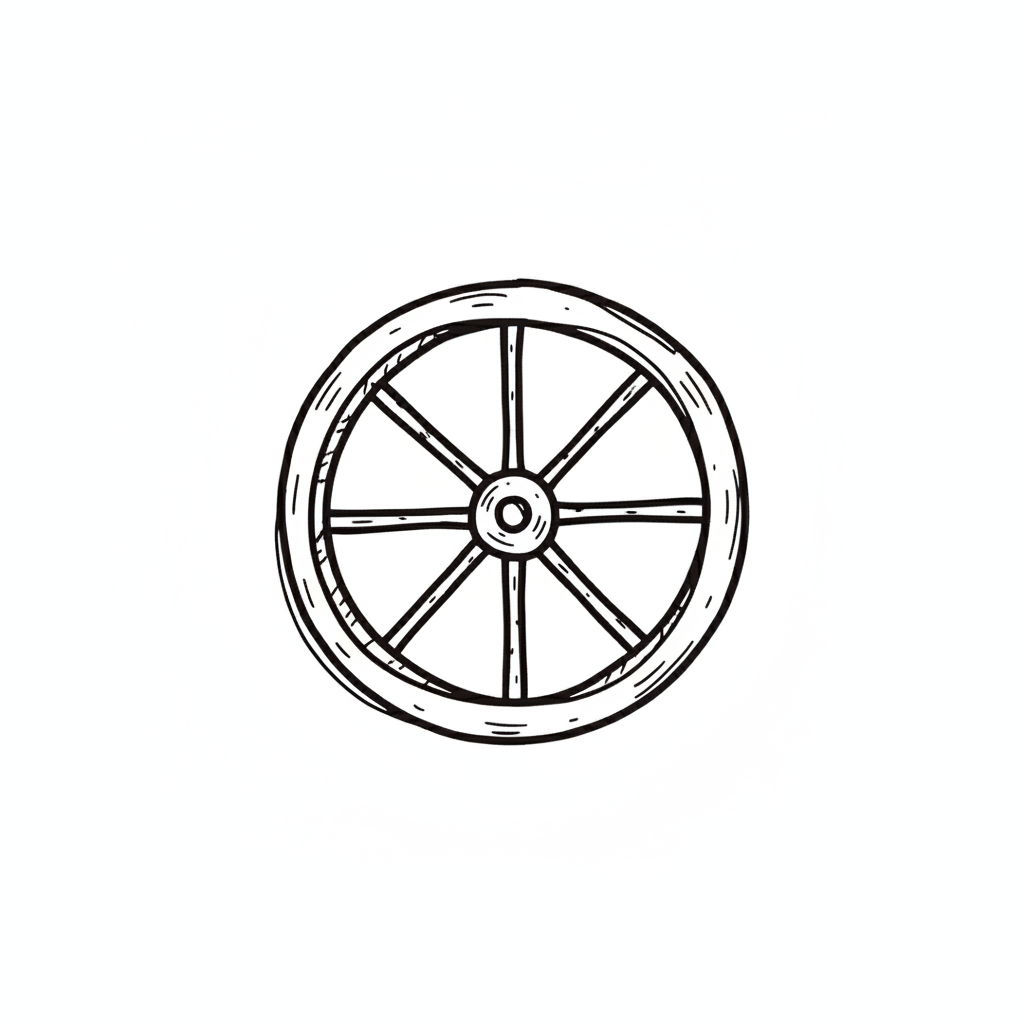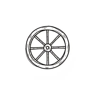 Handgezeichnetes, schwarz-weißes Holzrad mit Speichen auf weißem Hintergrund.