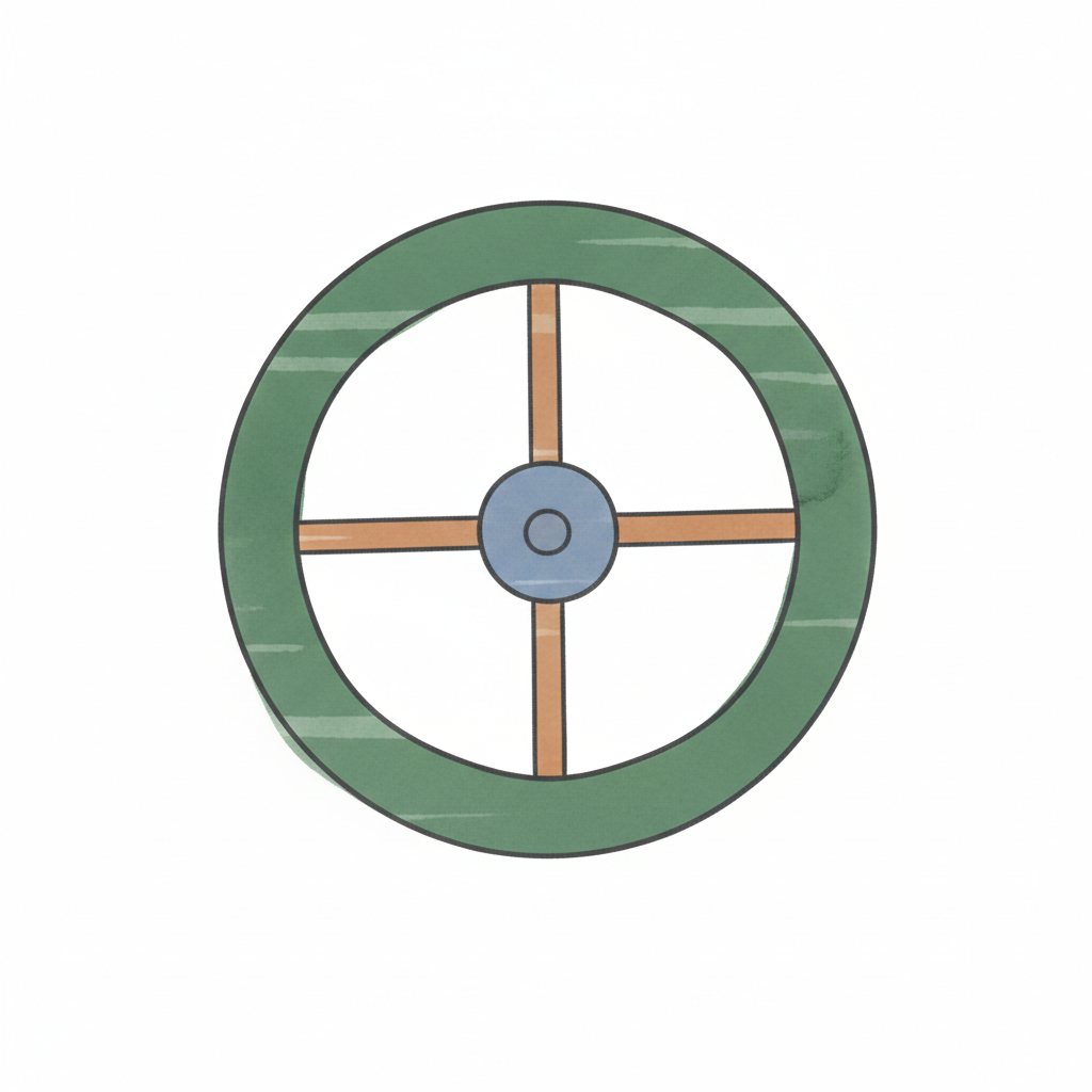 Einfache Cartoon-Zeichnung eines Rades mit grünem Reifen, braunen Speichen und blauem Mittelpunkt.