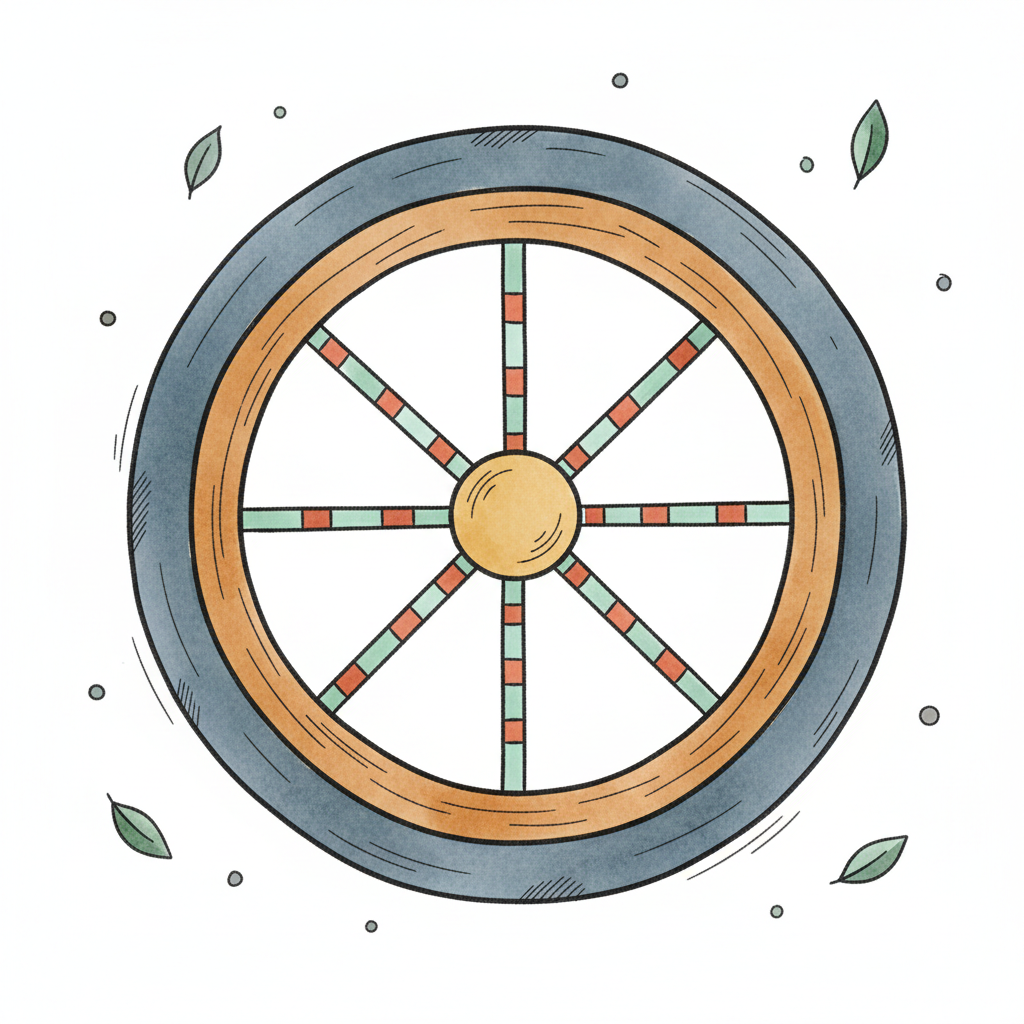 Buntes, handgezeichnetes Holzrad mit gestreiften Speichen und Blättern im Aquarellstil.