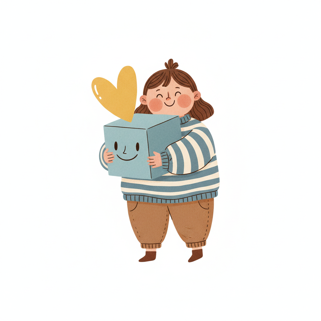 Glückliches Cartoon-Mädchen umarmt eine lächelnde Box mit einem schwebenden gelben Herz.