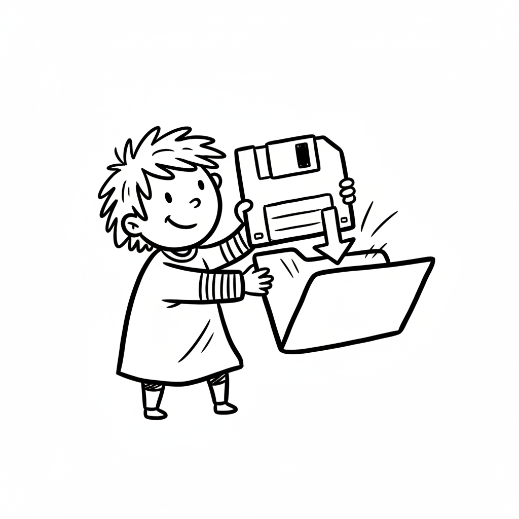 Ein Cartoon-Kind speichert Daten von einer Diskette in einen Ordner. Schwarz-Weiß-Zeichnung.