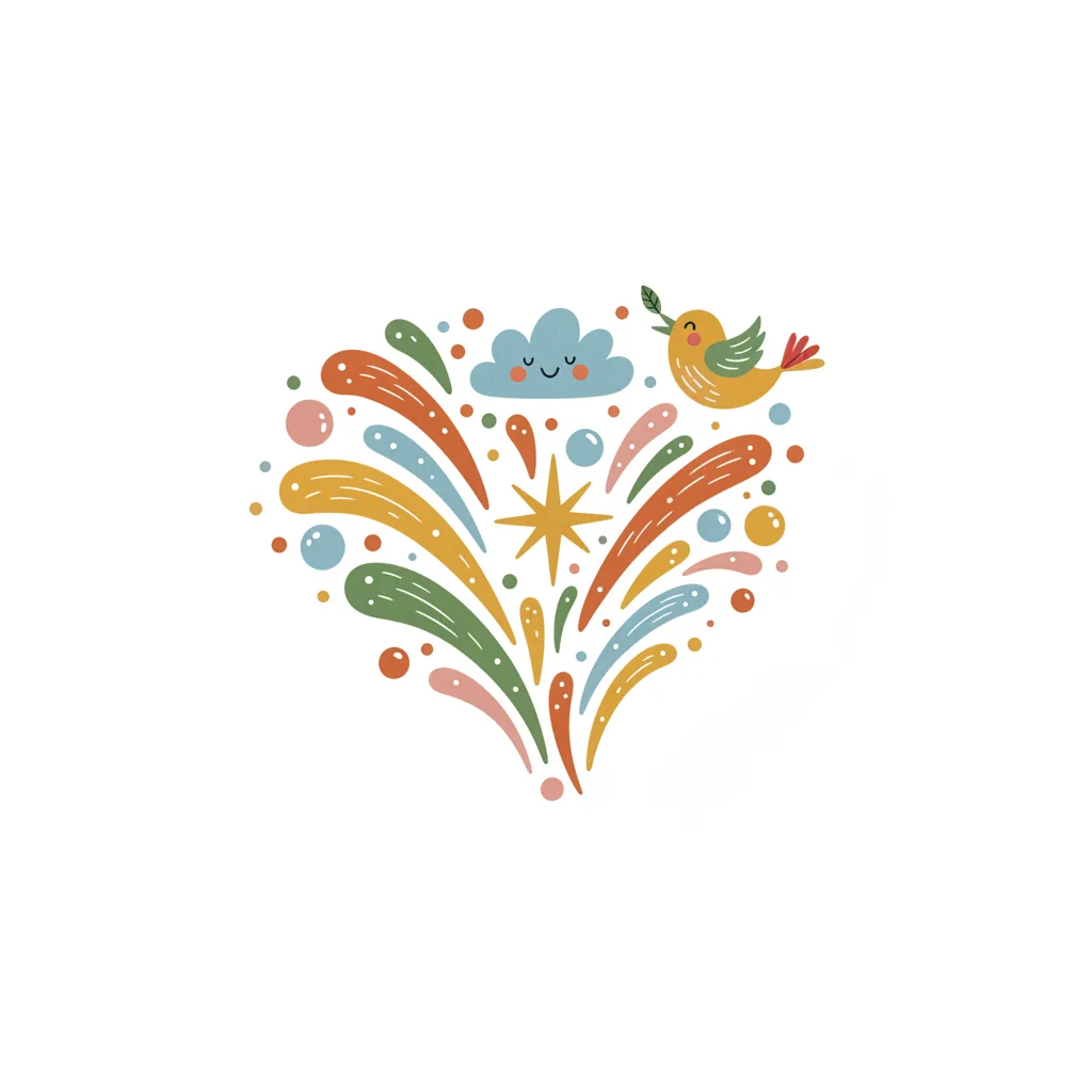 Fröhliche Illustration mit Vogel, lächelnder Wolke, Stern und bunten Formen, die ein Herz bilden.