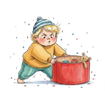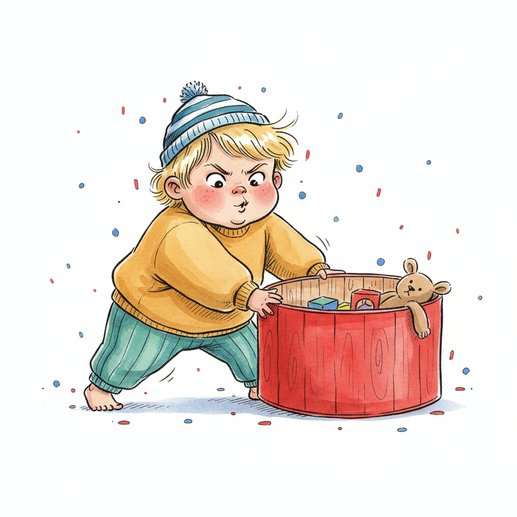 Wütendes Kleinkind in Mütze schiebt rote Spielzeugkiste mit Bär und Blöcken. Aquarell-Illustration.