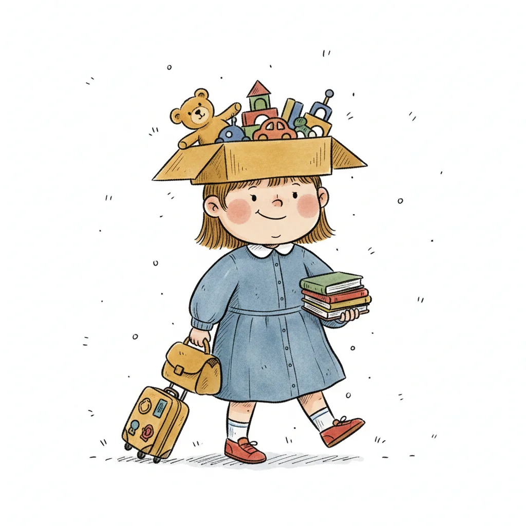 Fröhliches Mädchen mit Spielzeugkiste auf dem Kopf, Büchern und Koffer, bereit für ein Abenteuer.