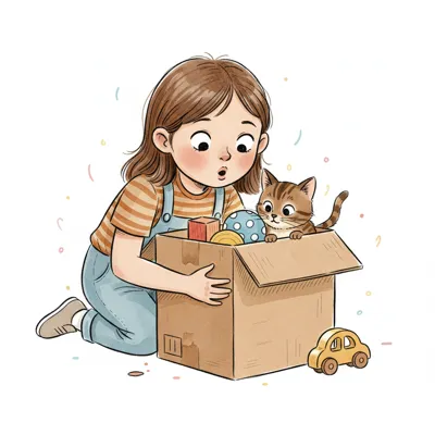Mädchen und Kätzchen schauen überrascht in eine Spielzeugkiste mit bunten Spielsachen.
