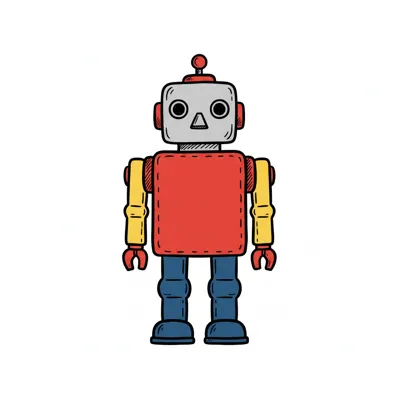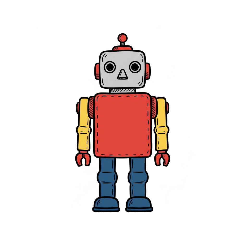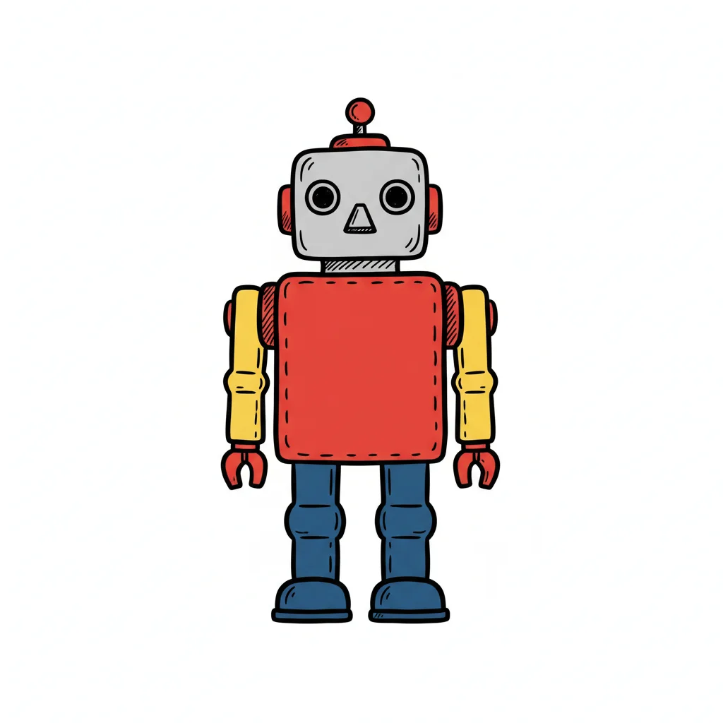 Niedlicher, bunter Cartoon-Roboter in Rot, Gelb, Blau und Grau auf weißem Hintergrund.