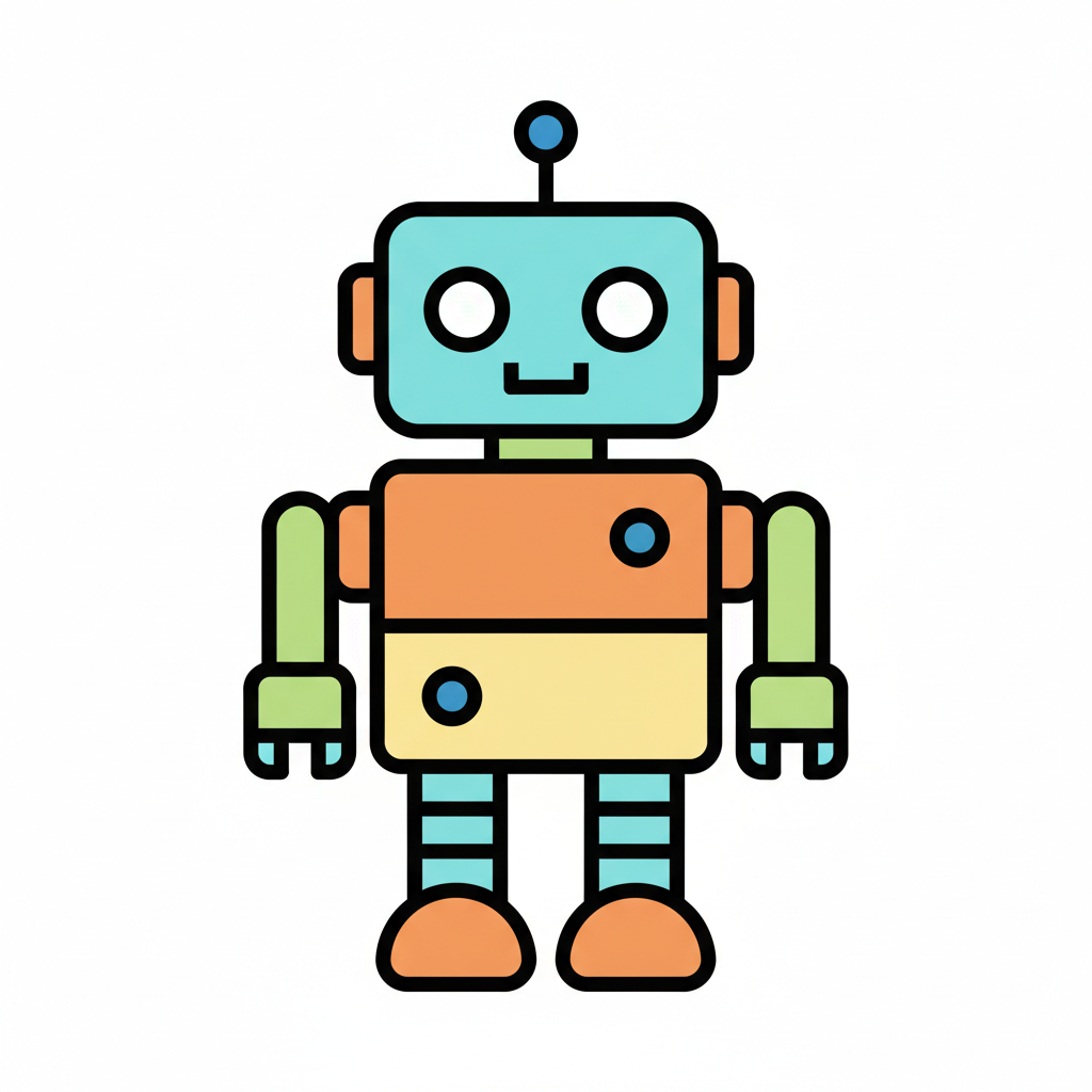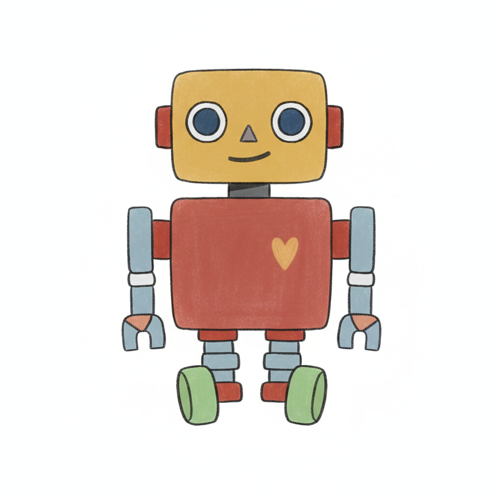 Niedlicher, bunter Cartoon-Roboter mit gelbem Kopf, rotem Körper und einem Herz auf der Brust.
