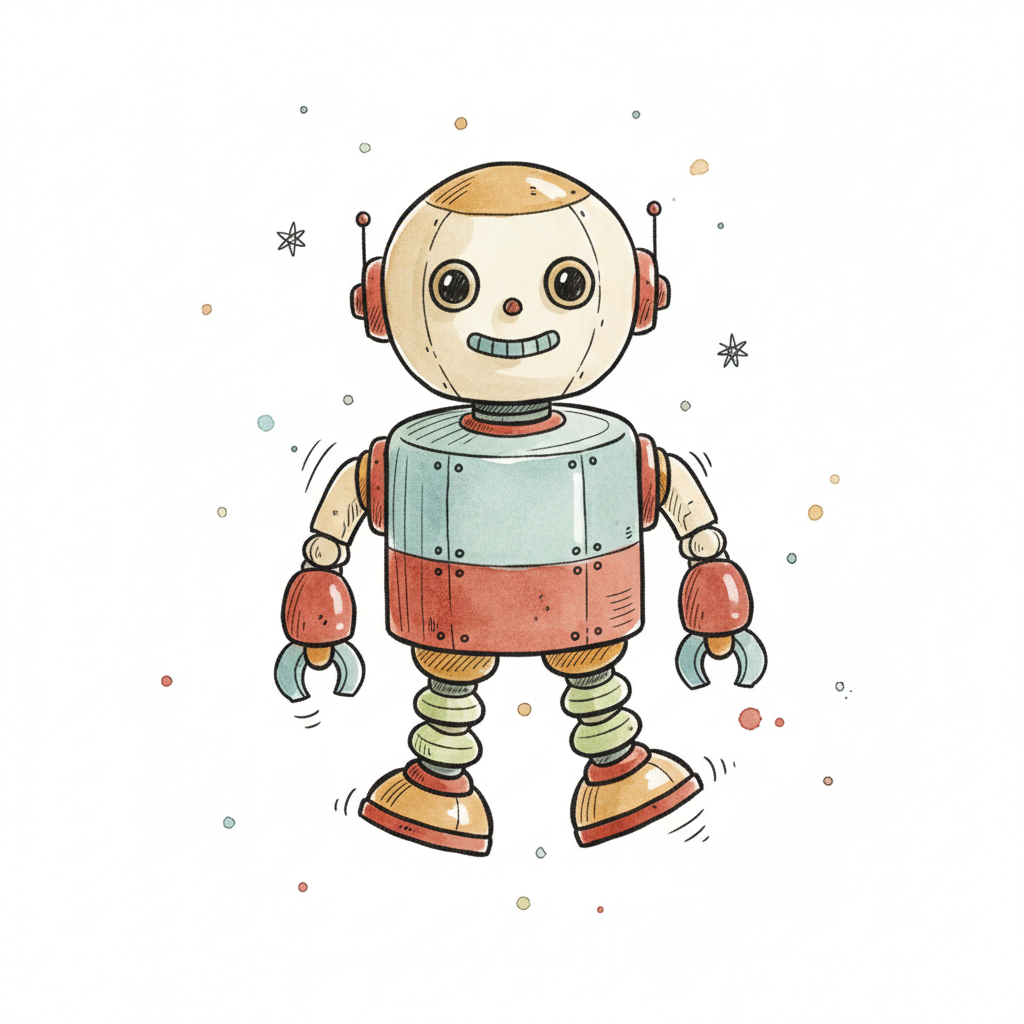 Ein freundlicher, bunter Roboter im Aquarell-Stil mit Antennen und Krallen.