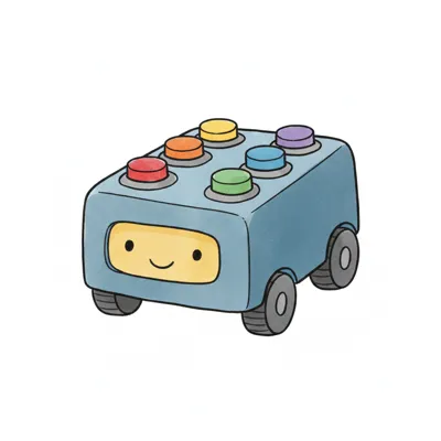 Niedlicher blauer Spielzeugroboter mit lächelndem Gesicht und bunten Knöpfen auf dem Dach.