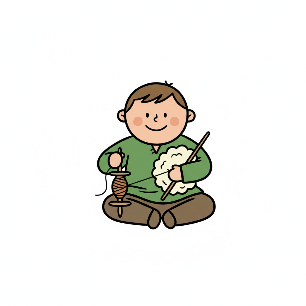 Ein blonder Cartoon-Junge sitzt und spinnt Wolle mit einer Handspindel.