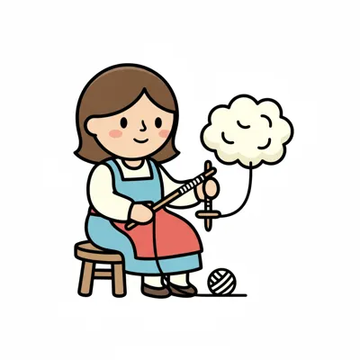 Illustration einer lächelnden Person, die sitzend Wolle mit einer Handspindel spinnt.