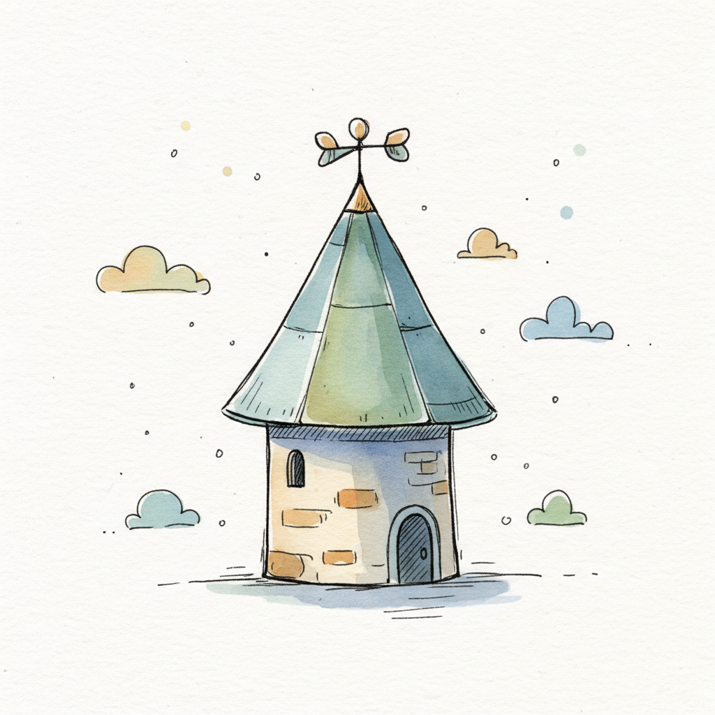 Niedliche Aquarell-Illustration eines kleinen Turms mit Wetterfahne und Wolken.