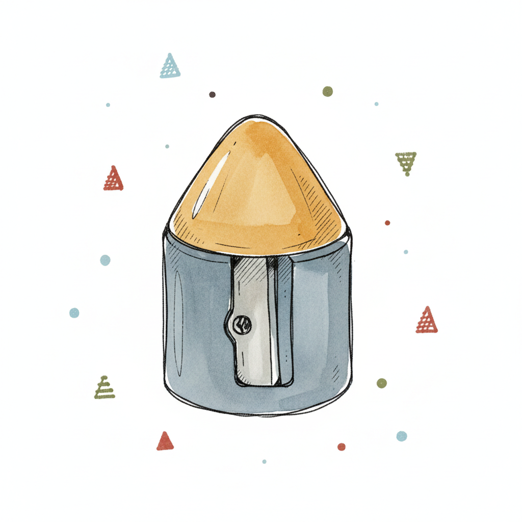 Eine handgezeichnete Illustration eines Bleistiftspitzers mit gelber Spitze und bunten Formen.