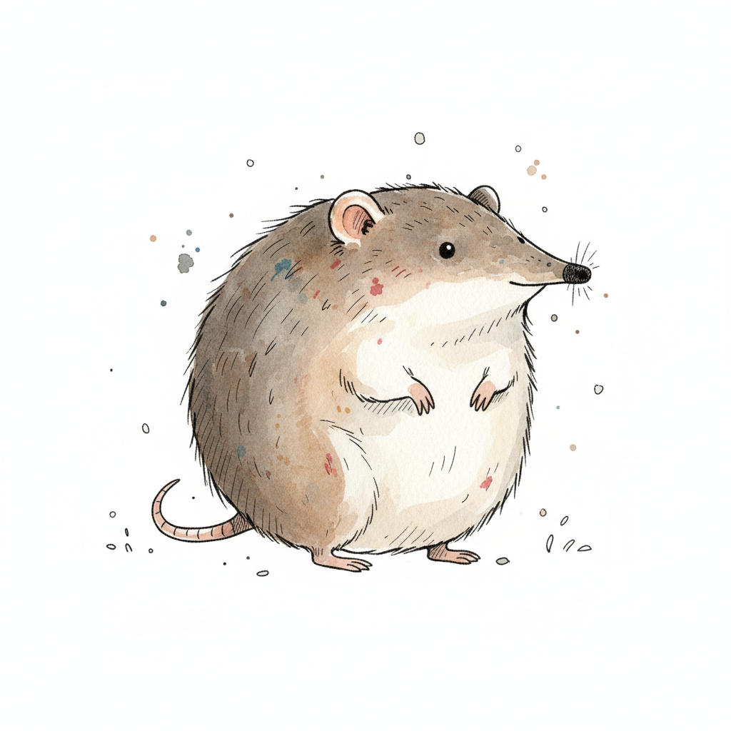 Niedliche, runde Spitzmaus-Illustration im Aquarellstil mit Farbspritzern auf weißem Grund.