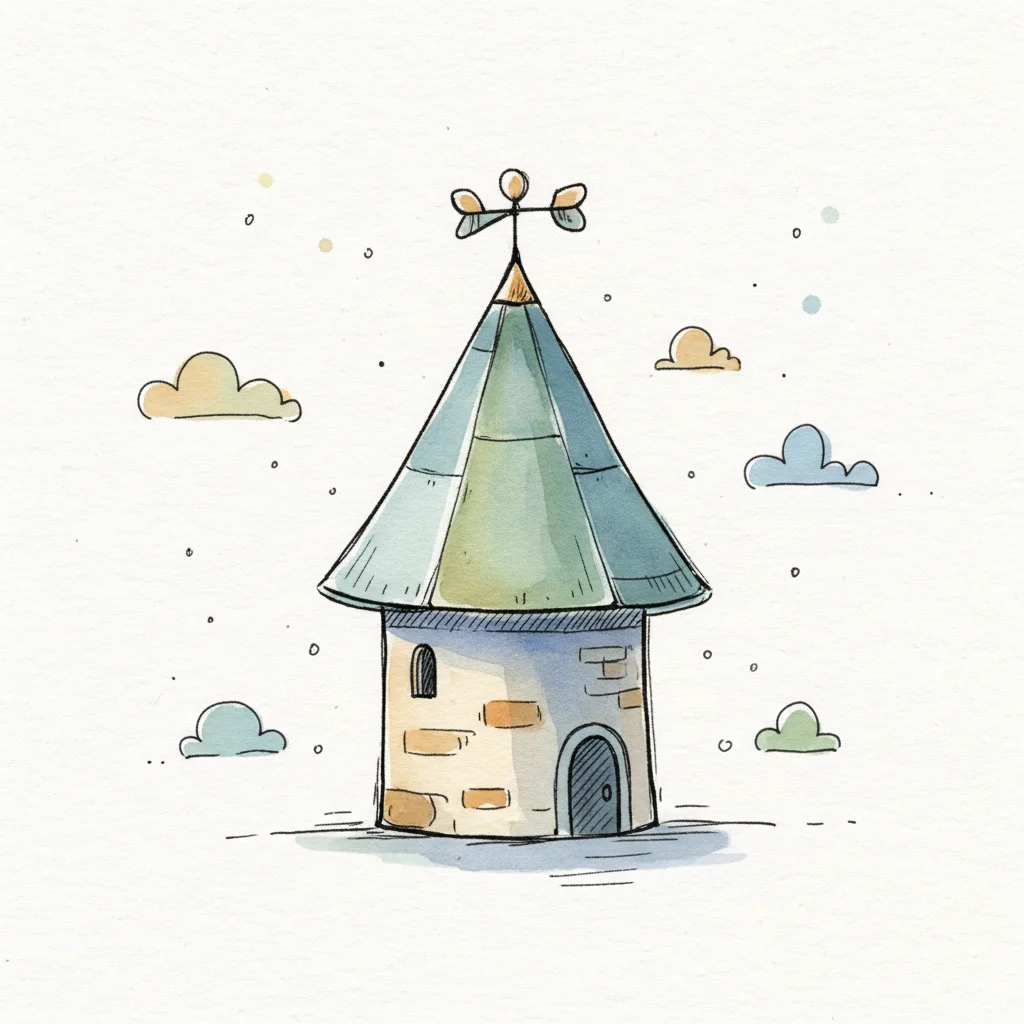 Illustration eines gelben Turms mit blauer Spitze und spiralförmiger Außentreppe, umgeben von Wolken.