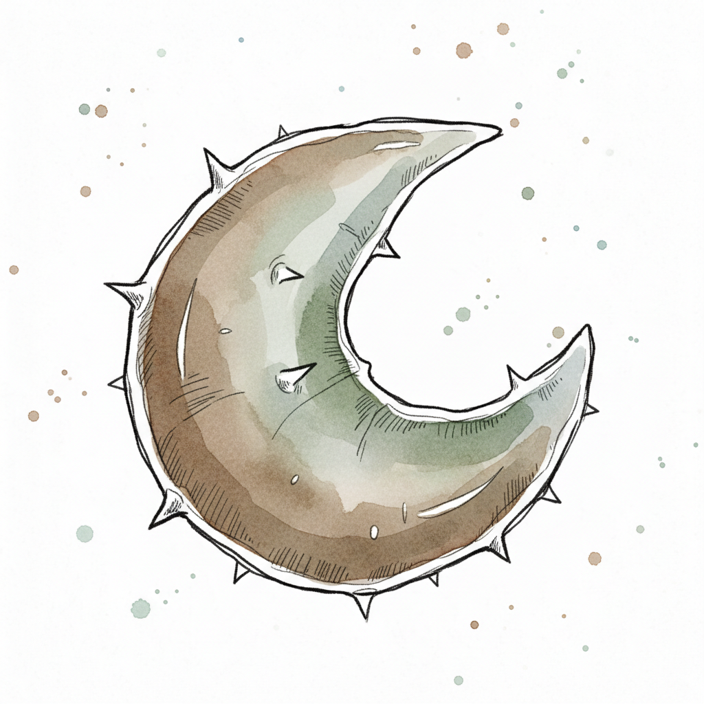 Spitzer Halbmond in Aquarellfarben mit Dornen und Farbspritzern auf weißem Hintergrund.