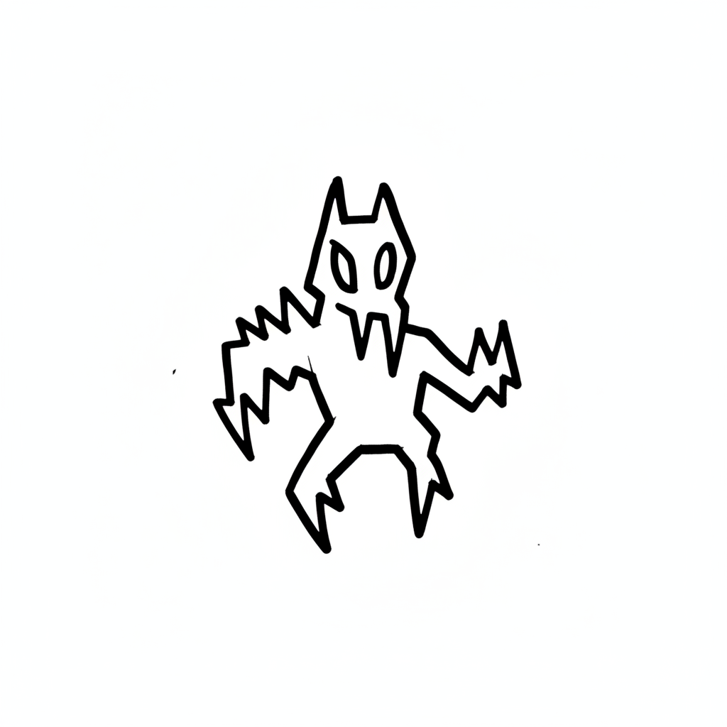 Stilisierte schwarze Umrisszeichnung eines zackigen Monsters mit spitzen Ohren und Reißzähnen.