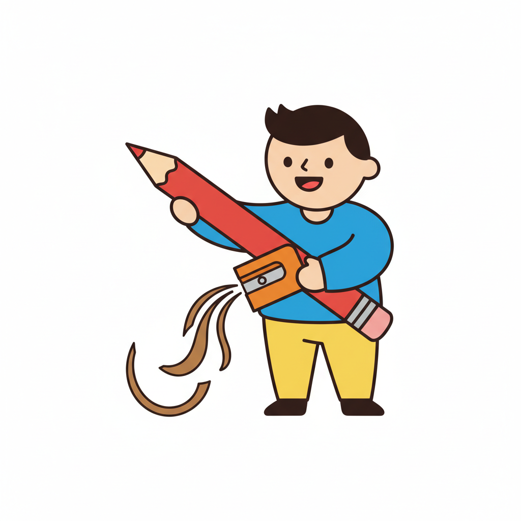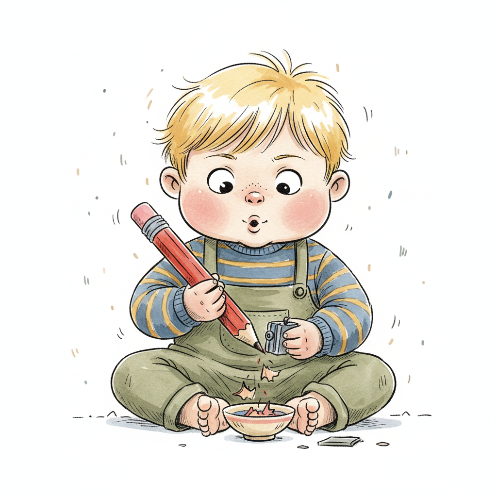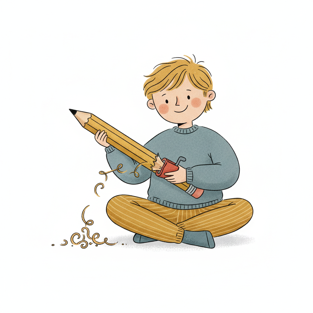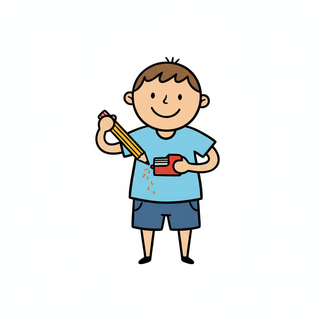 Ein lächelnder Cartoon-Junge spitzt einen Bleistift mit einem roten Spitzer, Späne fallen herunter.