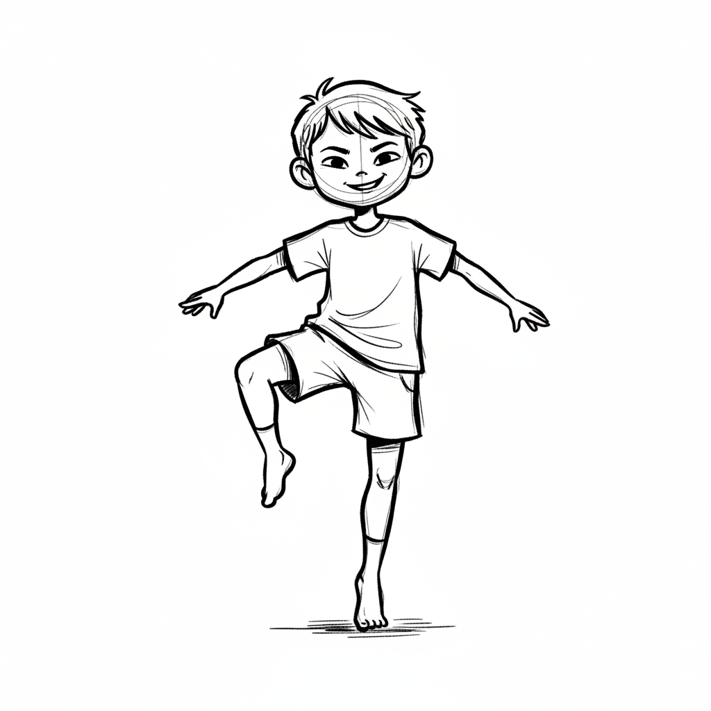 Schwarz-weiße Illustration eines lächelnden Jungen, der auf einem Bein balanciert.