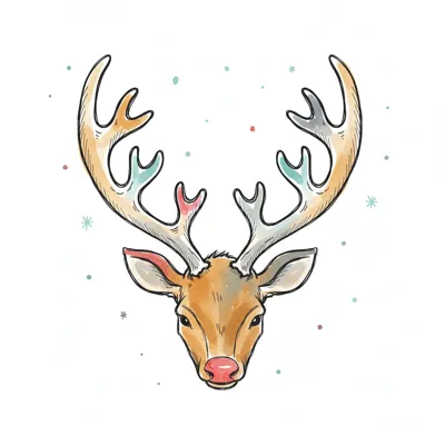 Aquarell-Illustration eines Hirschkopfs mit bunten Geweihspitzen und roter Nase auf weißem Hintergrund.