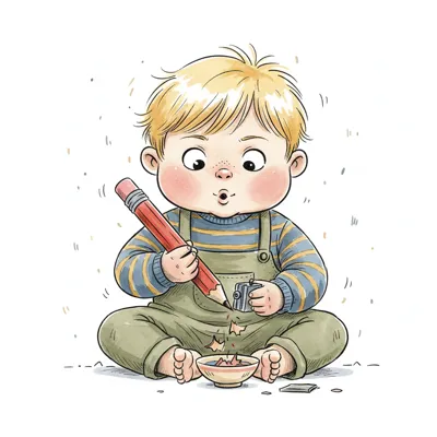 Blondes Baby schärft konzentriert einen roten Bleistift, Späne fallen in eine Schale.