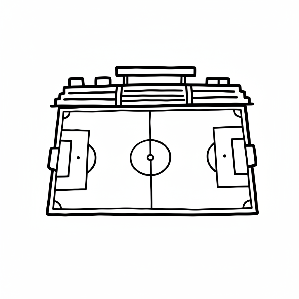 Schwarz-weiße Strichzeichnung eines Fußballstadions mit Spielfeld und Tribünen von oben.