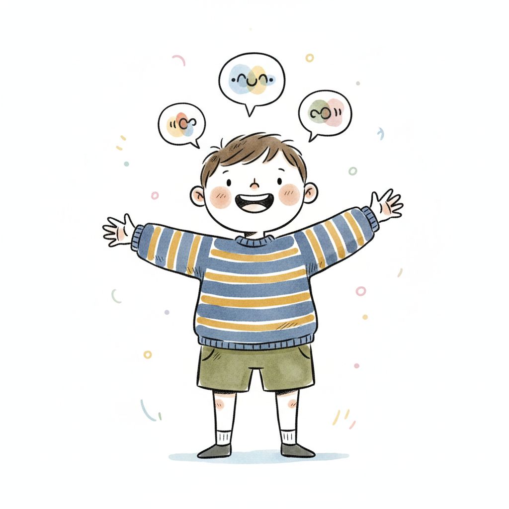 Ein fröhlicher Junge mit Sprechblasen über seinem Kopf.