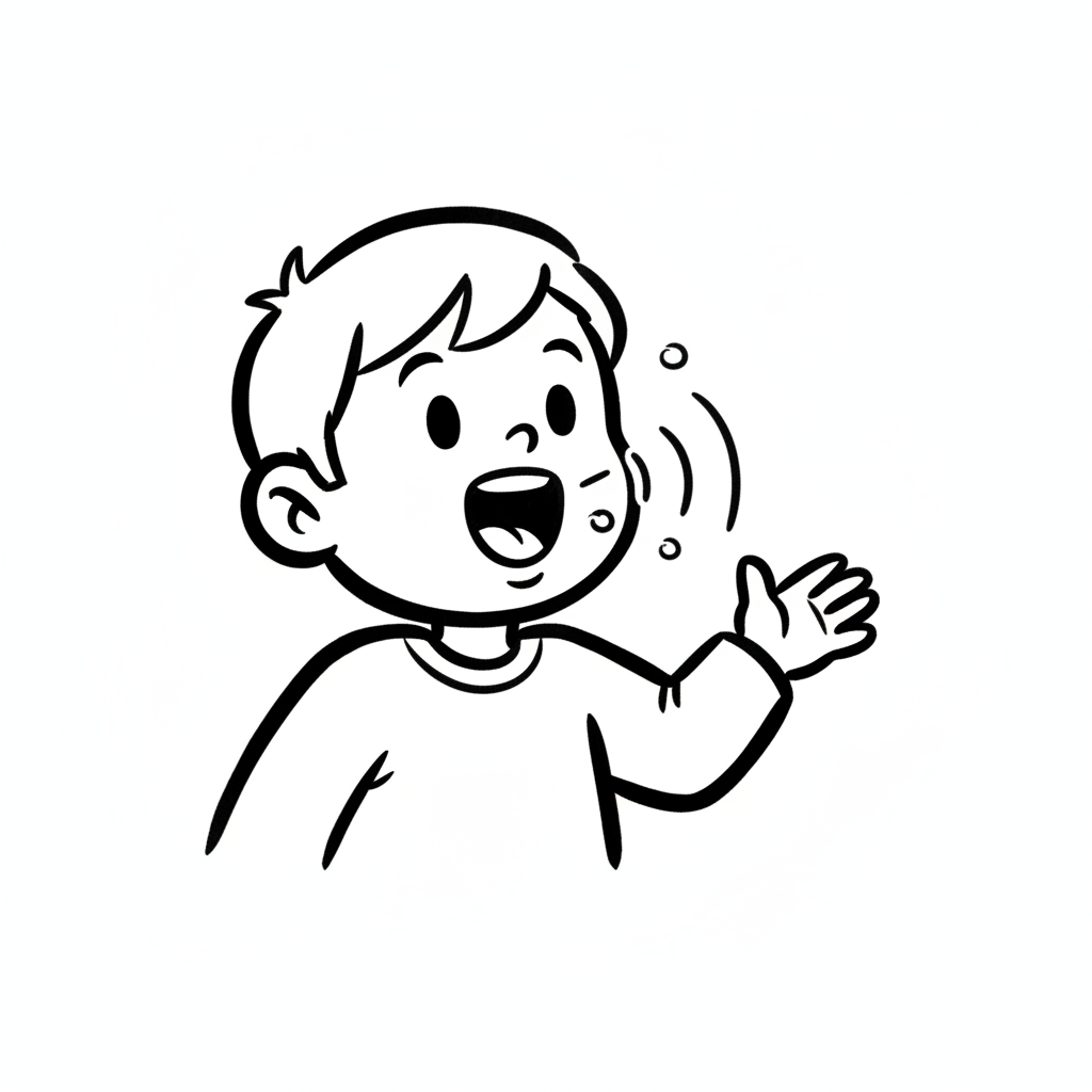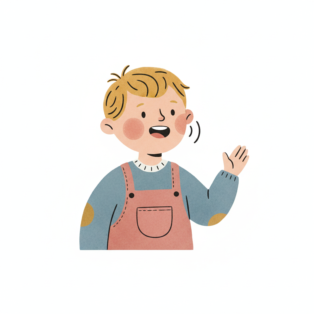 Ein fröhlicher Junge spricht und gestikuliert.