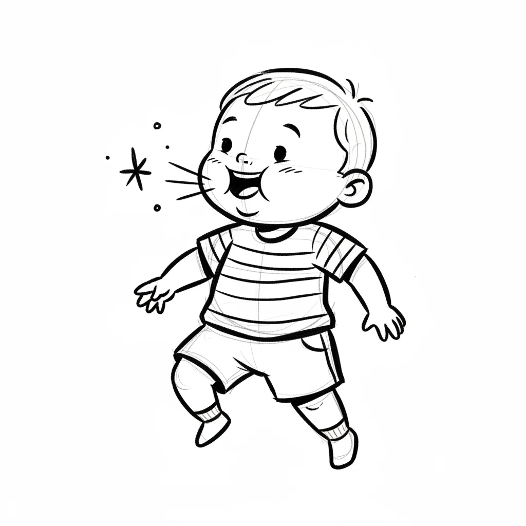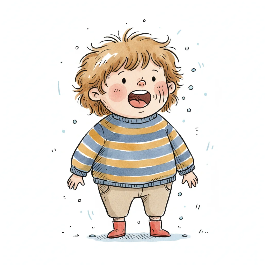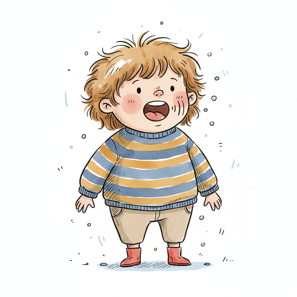 Niedliche, kindgerecht illustrierte Szene mit einem Kind oder einer Person als Hauptfigur, vor rein weißem Hintergrund, im frech-nordischen Aquarell-Skizzenstil. Klare, leicht wackelige Tuschekonturen, sichtbare Pinsel- und Strichtextur, dezente Schraffuren, weiche handgemalte Farbflächen in gedeckten Farben. Einfache, runde Formen. Keine harten Schatten, sondern sanfte, transparente Aquarellschichten. Leicht raue, handgezeichnete Linien statt glatter Vektorkanten. Subtile, vereinzelte Kritzelpunkte oder kleine Details im Hintergrund (wie Pünktchen oder feine Striche), aber keine echte Umgebung oder Landschaft. Die Figur ist mittig zentriert. Insgesamt charmant, humorvoll, warm und handgemacht wirkend. WICHTIG: Das Bild darf ABSOLUT KEINEN TEXT, KEINE BUCHSTABEN und KEINE ZAHLEN enthalten.