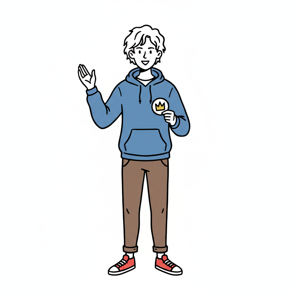 Illustration eines lächelnden Mannes in blauem Hoodie, winkend, mit Kronen-Badge.