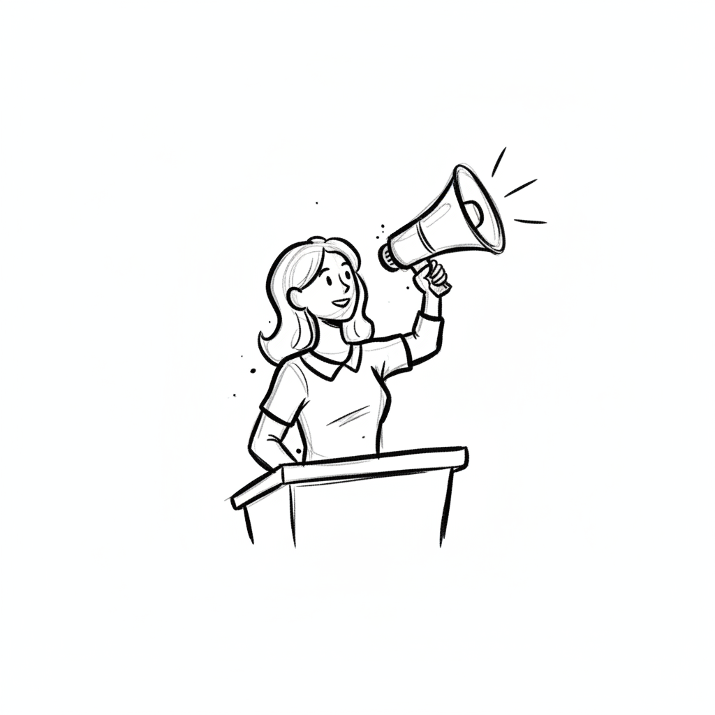 Schwarz-Weiß-Skizze einer Frau am Rednerpult, die mit einem Megafon spricht.