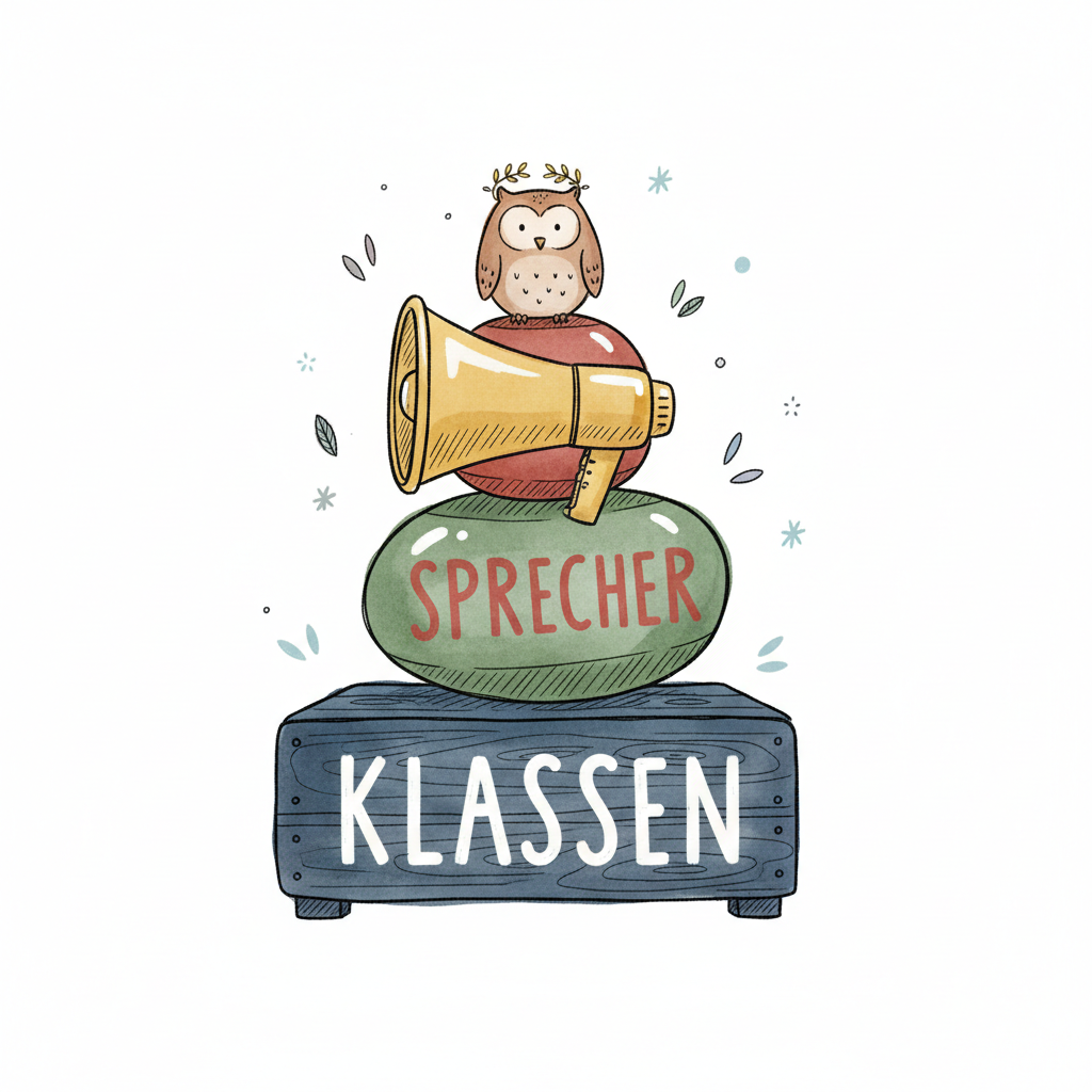Illustration einer Eule mit Megafon auf Steinen, beschriftet mit 'Sprecher' und 'Klassen'.