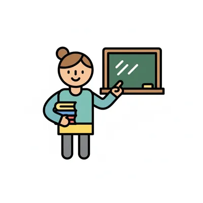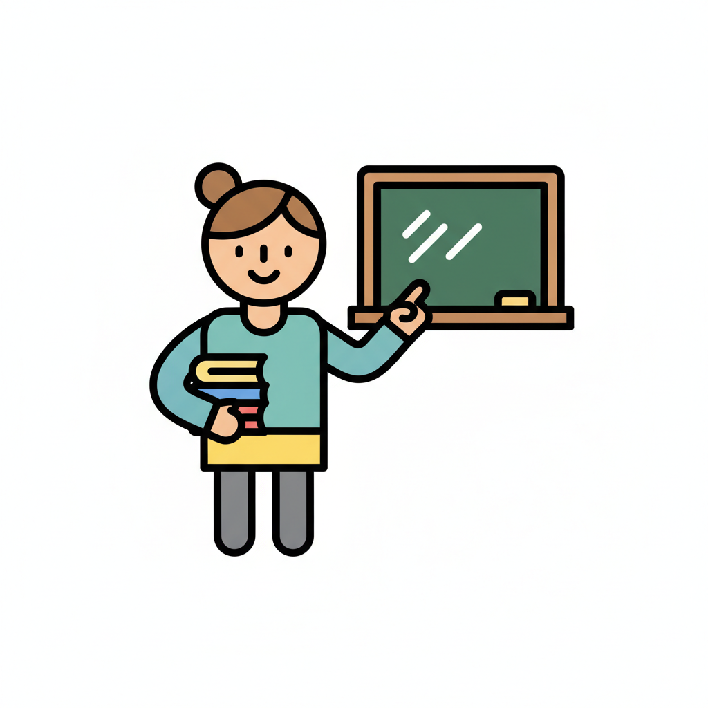 Illustration einer lächelnden Lehrerin mit Büchern, die auf eine Tafel zeigt.