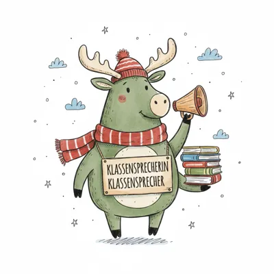 Niedlicher Elch mit Megafon, Büchern und Schild 'Klassensprecher/in' in Winterkleidung.